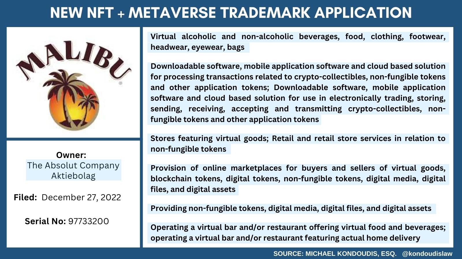 Malibu will be joining the likes of whiskey-makers Jack Daniels and Kinahan's in web3–among many others. While it seems to be yet another brand not wanting to feel left out, the most interesting part of the trademark application could be the virtual bar/restaurant "featuring actual home delivery".